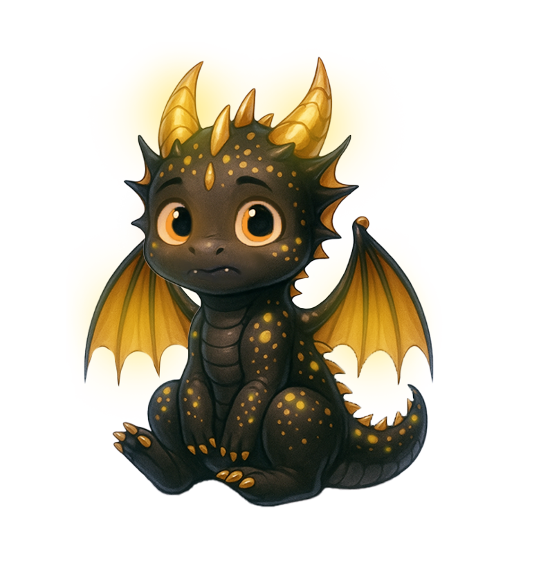 À sua frente, com escamas que brilhavam como obsidiana, estava um filhote de dragão. Seus olhos dourados o observavam com intensidade, ao mesmo tempo que tremiam e cintilavam sob a luz fraca da lua. Nas laterais do crânio, pequenas protuberâncias reluzentes se alongavam e outras iam em direção às costas, como delicados chifres de ouro. O brilho dourado também cobria o interior translúcido das asas minúsculas e algumas manchas circulares que pontilhavam seu dorso e pescoço.