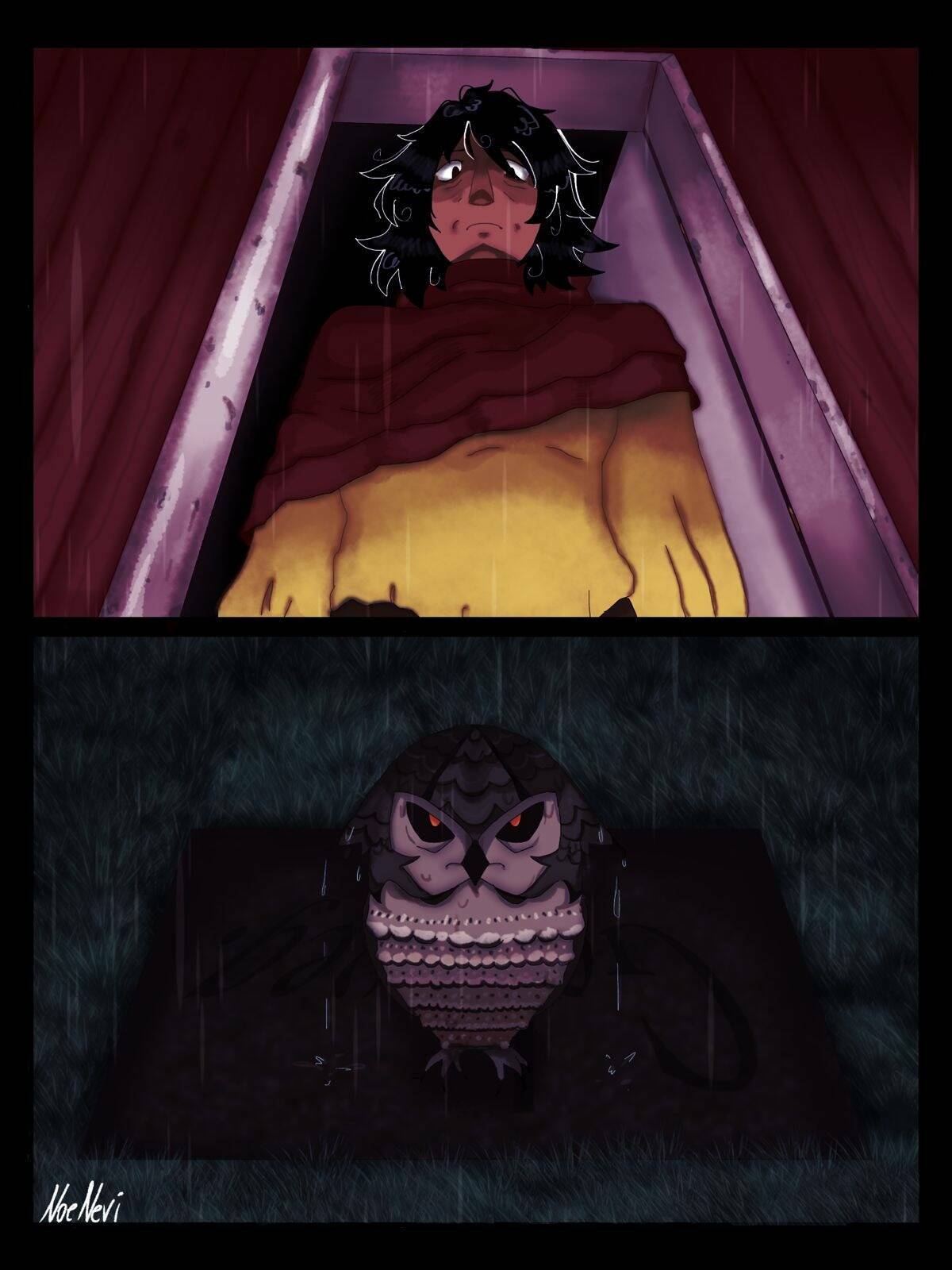 Sem opções, acabei cedendo e o deixando entrar. Porém, assim que o fiz, senti uma dor no peito e, ao ver o céu noturno, lembrei daquele pesadelo. Para piorar, pouco antes da coruja dar o primeiro passo para dentro de casa, tive a impressão de que ela estava sorrindo… Por tanto, sem pensar duas vezes, o interrompi novamente.