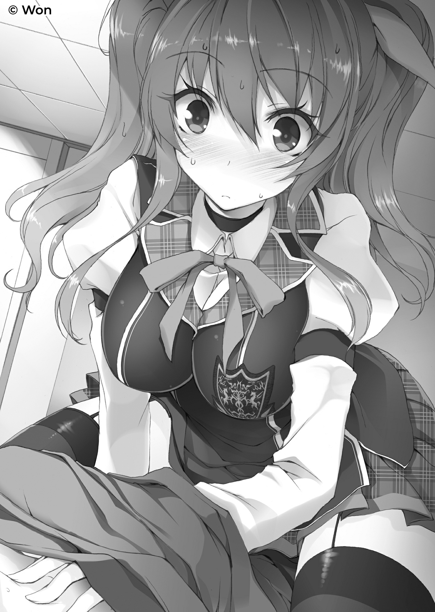 Além disso, os peitos dela eram grandes o suficiente para serem notáveis mesmo através de seu uniforme e estavam empurrando para cima o laço que estava amarrado ao seu blazer.