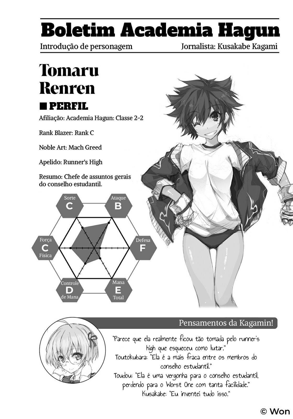 “Kurogane-kun tem uma reserva de mana excepcionalmente pequena, então ele normalmente não usa mana para propulsão. Ele ficaria sem nada após um ou dois usos se fizesse isso. Mas só porque ele não usa essa técnica não significa que não consiga. Parece que, por algum motivo, ele não pode usar o Ittou Shura agora, então decidiu usar a pouca mana que tem para aceleração.”