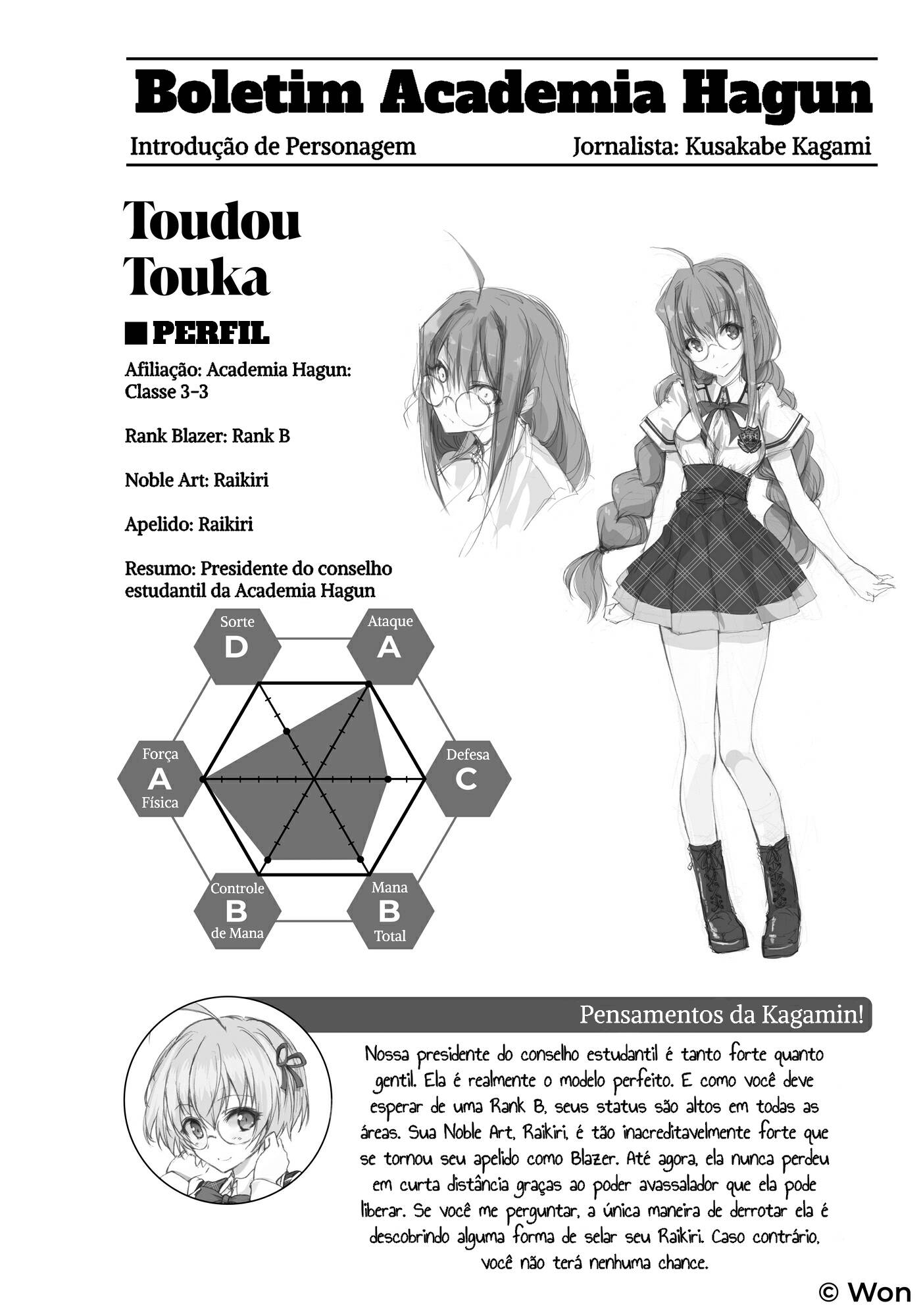 “Claro, isso também se deve em parte ao fato de que a maioria das pessoas que é expulsa já faz coisas quase criminosas para merecer a expulsão, mas ainda assim, do ponto de vista da Federação, é melhor manter cães raivosos na coleira do que deixá-los soltos”, acrescentou Kagami. “É por isso que eles querem eventualmente administrar todos os Blazers em todos os lugares. Muitos dos países que aderiram à Federação Internacional dos Cavaleiros-Magos inclusive têm leis que exigem legalmente que todos os Blazers se tornem cavaleiros. Mas lugares como o Japão têm organizações de direitos humanos bastante ativas, então ainda não chegamos tão longe por aqui.”