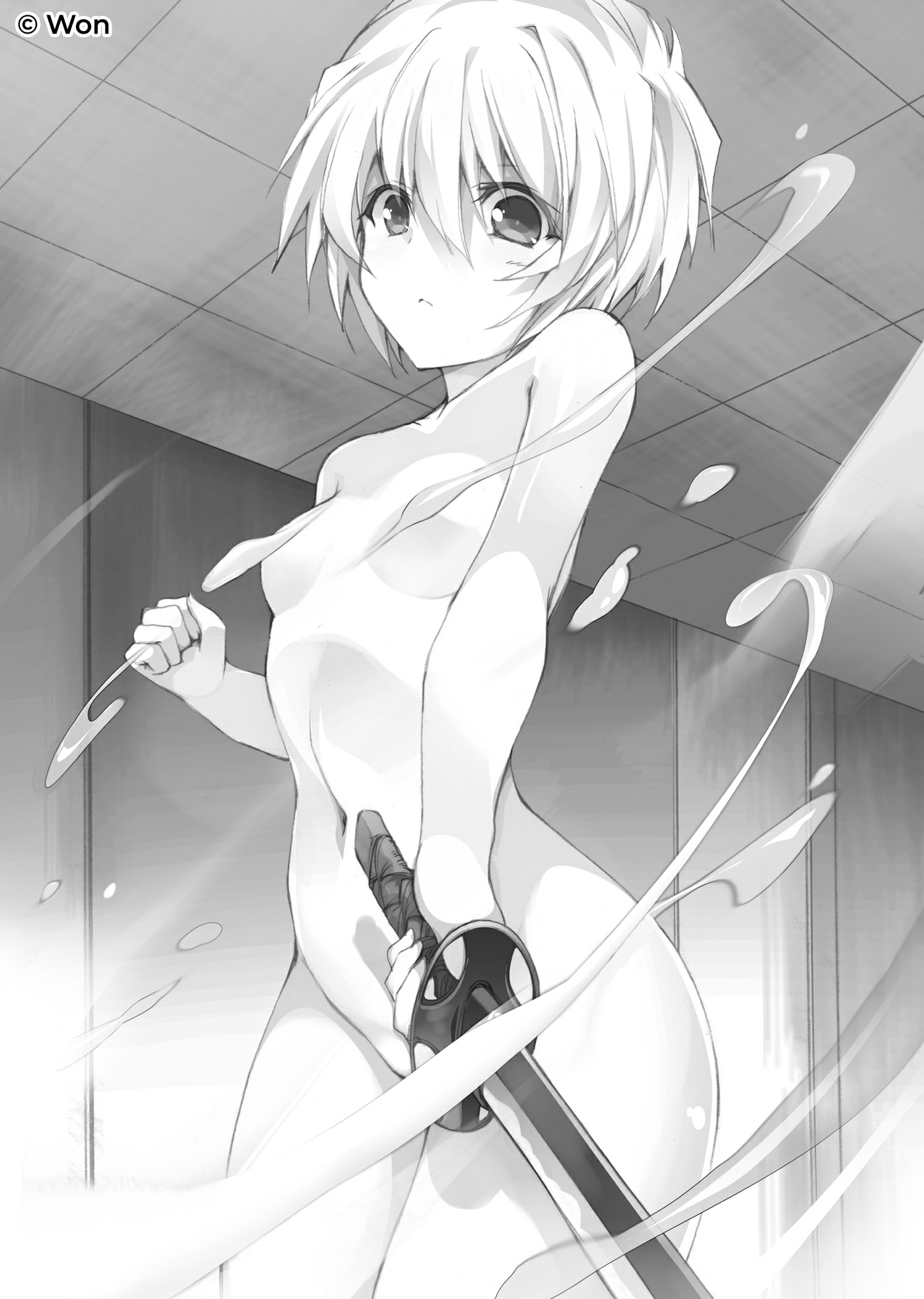 “Não me diga que...” Ele já vira batalhas o suficiente para intuir o que Shizuku fizera. Entrando em pânico, ele brandiu sua espada longa contra ela. Ela nem se deu ao trabalho de tentar esquivar, e o Device de Wallenstein mais uma vez bissecou Shizuku. Mas não houve jorro de sangue, e as duas metades do corpo de Shizuku apenas se separaram como névoa antes de se reformarem novamente. Ao ver aquilo, Wallenstein soube que sua suspeita estava correta. “S-Sua monstra! Você transformou seu corpo inteiro em vapor de água!”