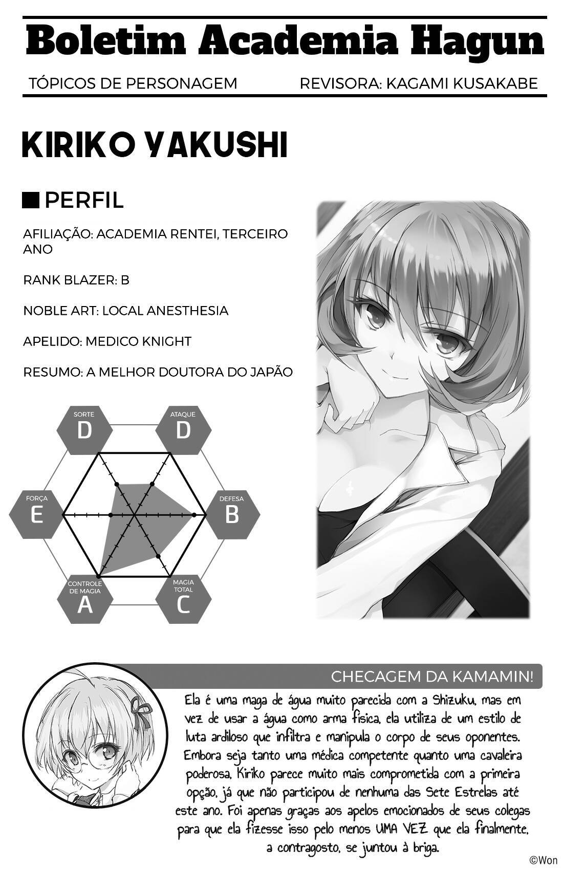 “Sim. Nós, Blazers, podemos usar Noble Arts, que são essencialmente magia. A habilidade de devorar a magia de outros Blazers dessa forma dá a ele uma vantagem incrível sobre quase qualquer pessoa. O gelo de Lorelei, o fogo da Princesa Carmesin, o vento do Gale Sword Emperor — nada disso funciona no Moroboshi. O seu Tiger King pode simplesmente devorar tudo.”