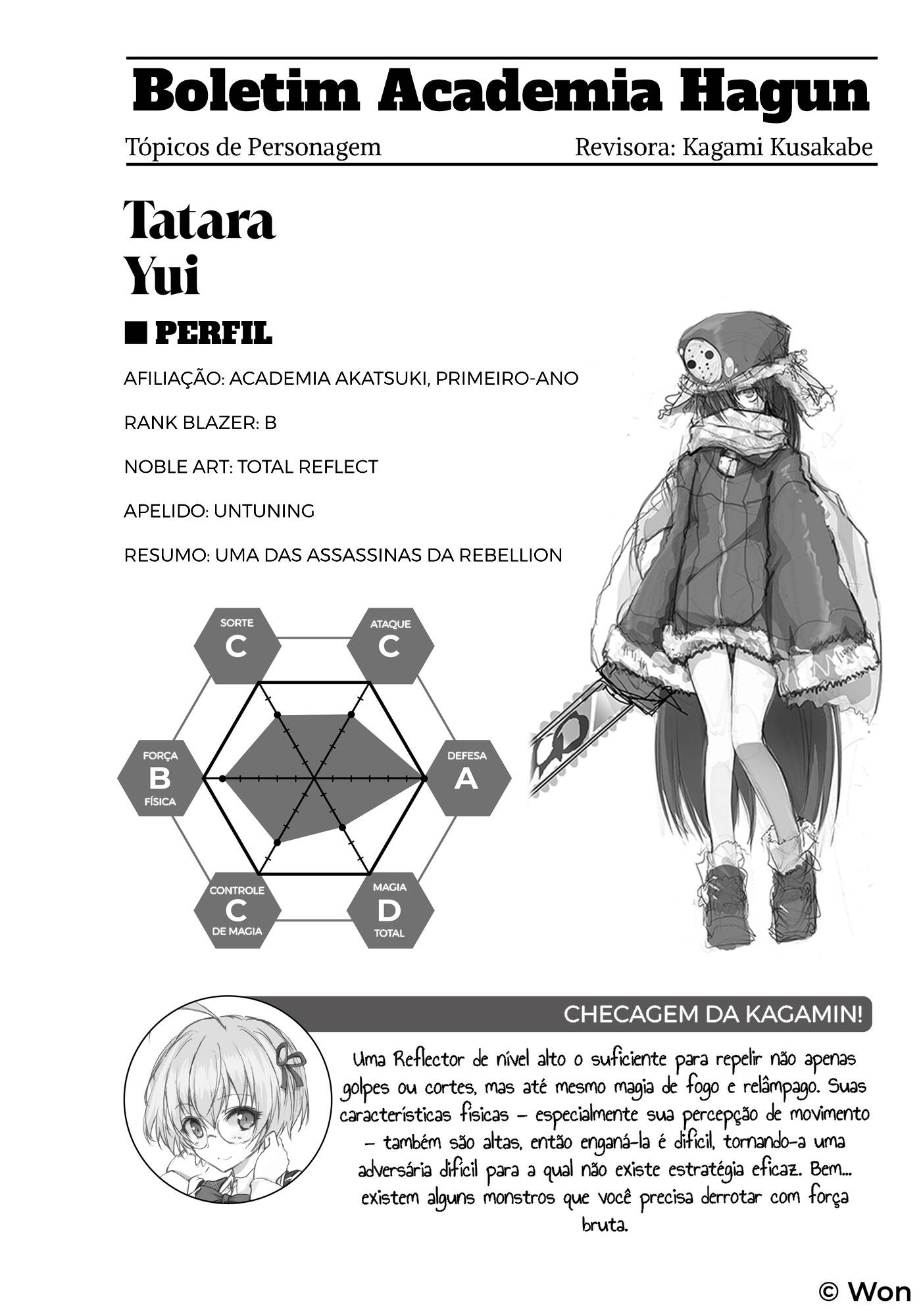 “Na terceira partida do bloco B desta manhã, Tatara enfrentou Niidome, da Rentei. O golpe de machado dele foi repelido por uma força invisível, e ela aproveitou o enorme recuo para cortá-lo e assim derrotá-lo. Sua habilidade é definitivamente a reflexão de força — um poder de combate incrivelmente potente. Alguém poderia deixar uma brecha enorme e acabar se autodestruindo se simplesmente atacasse de forma imprudente... e, dado o poder ofensivo de Stella, não bastará apenas chamar isso de uma brecha.”