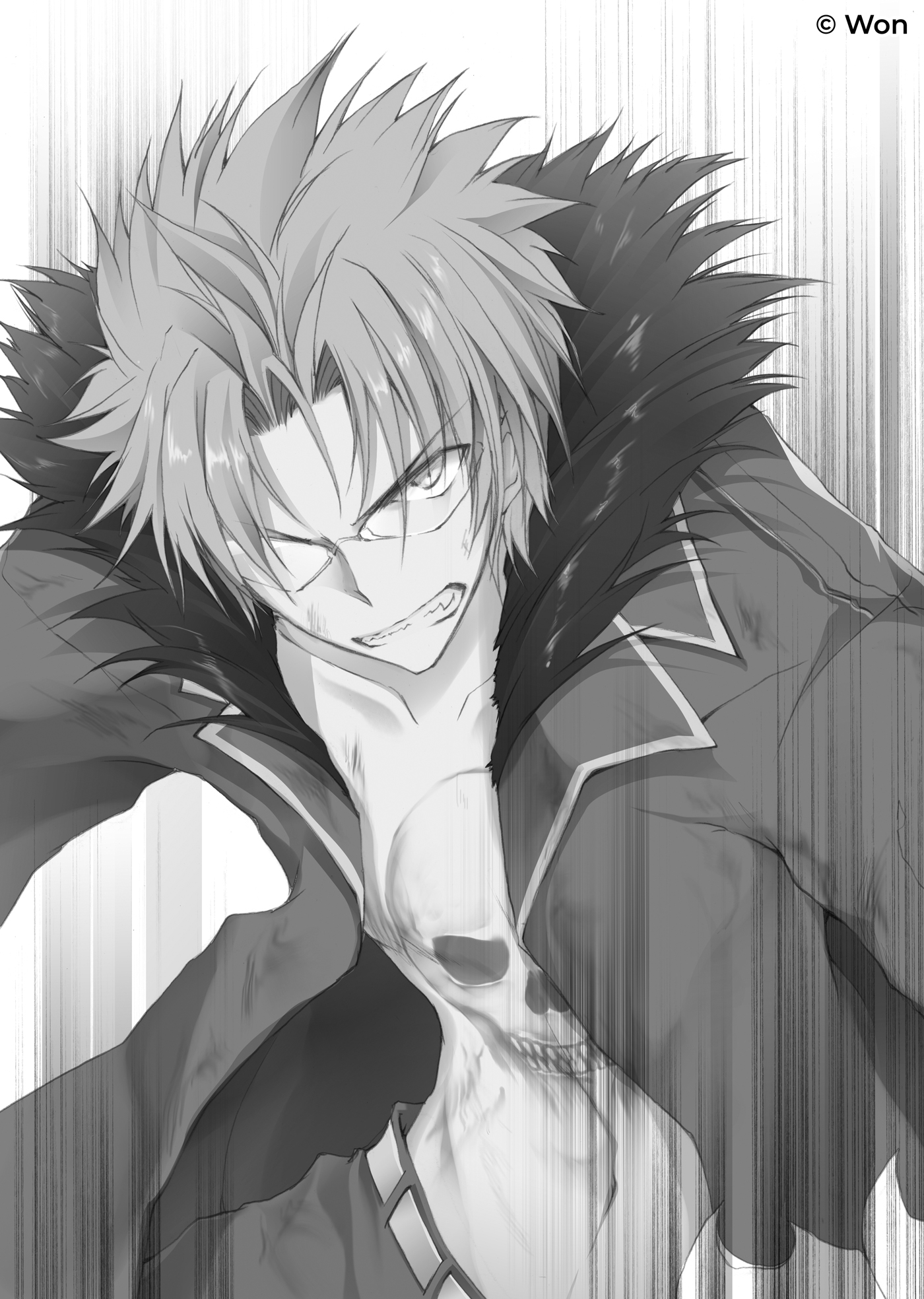 Um ataque que retalhou diagonalmente sua tatuagem de caveira exposta. O golpe de lâmina inesperado fez Kuraudo cambalear, seu sangue espirrando. Mas seu choque era maior que o dano do ferimento. Seus olhos estavam fixos e arregalados diante da realidade impossível à sua frente, e ele não tinha palavras. Nem era ele o único surpreso.