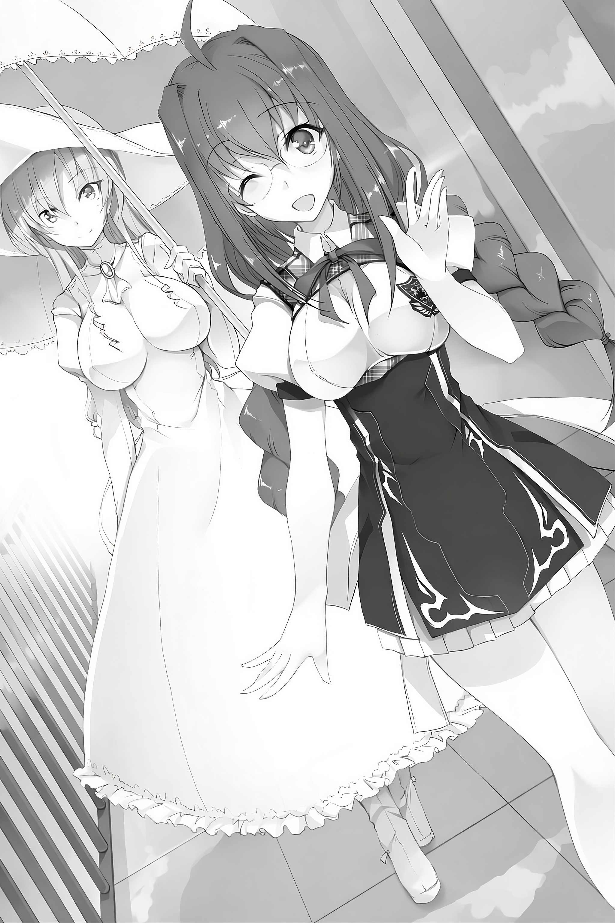 Cabelos cor de castanha presos em uma trança de três mechas, uma garota de porte gentil, Raikiri, Touka Toudou, e uma garota alta segurando uma sombrinha, amiga de Touka, Scharlach Frau, Kanata Toutokubara, estavam paradas ali.