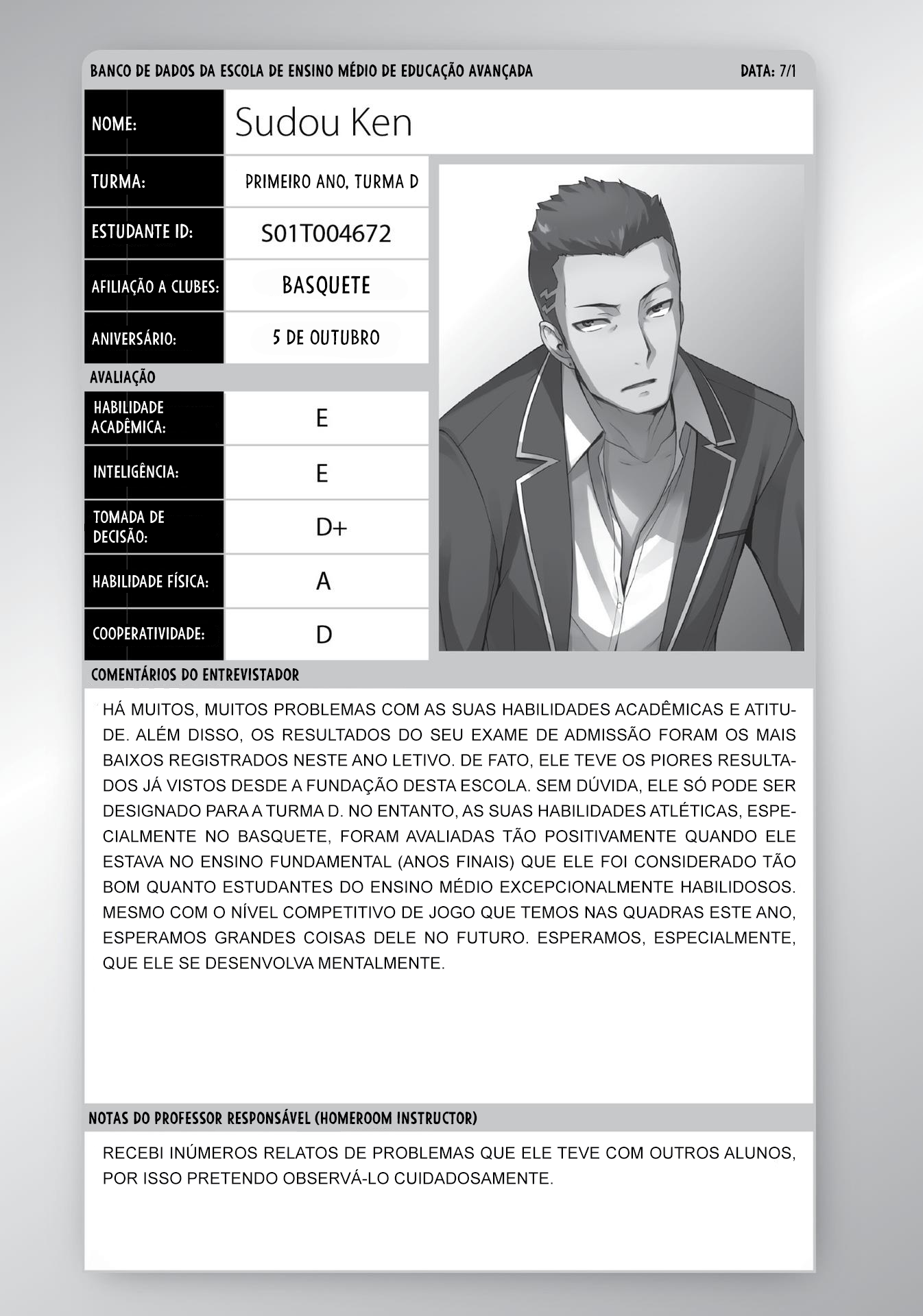 Lembrei-me da conversa deles atrás do dormitório. Eu não compreendia totalmente a situação, mas suspeitava que Horikita havia seguido seu irmão extremamente talentoso, matriculando-se na mesma escola para que ele reconhecesse suas habilidades. Mas, independentemente de suas esperanças e talentos, a irmã mais nova da Classe D ainda estava muito distante de seu irmão, o presidente do conselho estudantil da Classe A. Para se provar, ela teria que subir ao mesmo nível que ele.