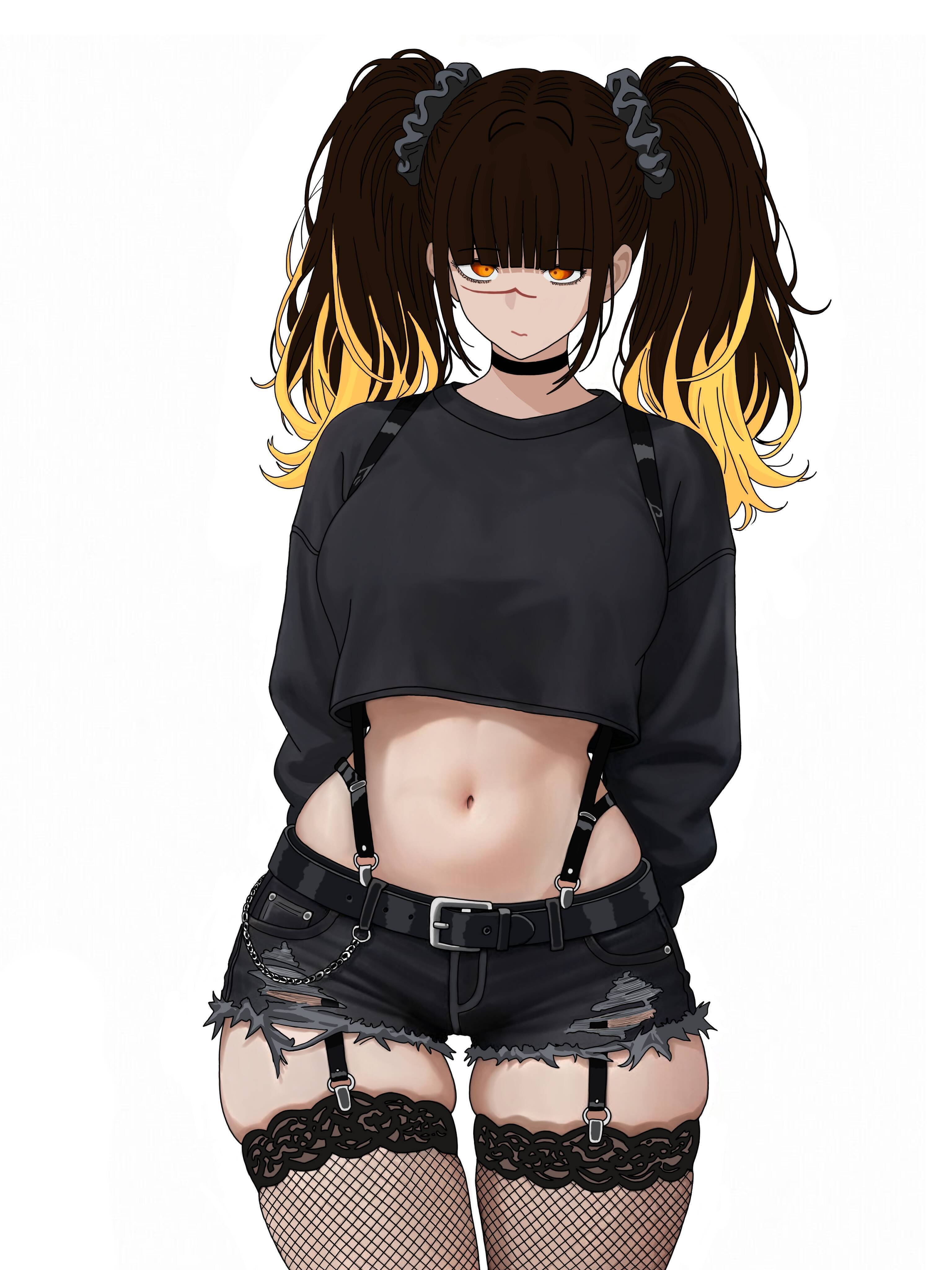 Ligas conectavam o short, subindo e passando pelo lado de cada seio farto, dobrando nos ombros e se prendendo no shortinho por trás... Por baixo dele... havia outras. Conectando outras ligas às meias arrastão, finalizadas com renda na parte superior das coxas da bela moça hipnotizada pelo toque suave em seu queixo dado por sua amada demônio.