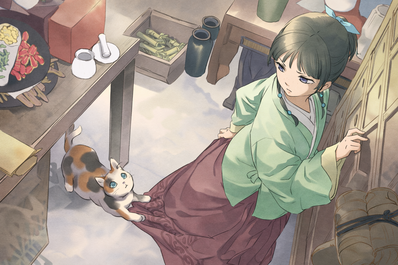 De repente, ela se viu com Maomao, a gata, enrolada em seus tornozelos, quando ela havia chegado ali? Tentou empurrar a gatinha para o lado, incomodada, mas a gata passou as garras pela saia de Maomao.