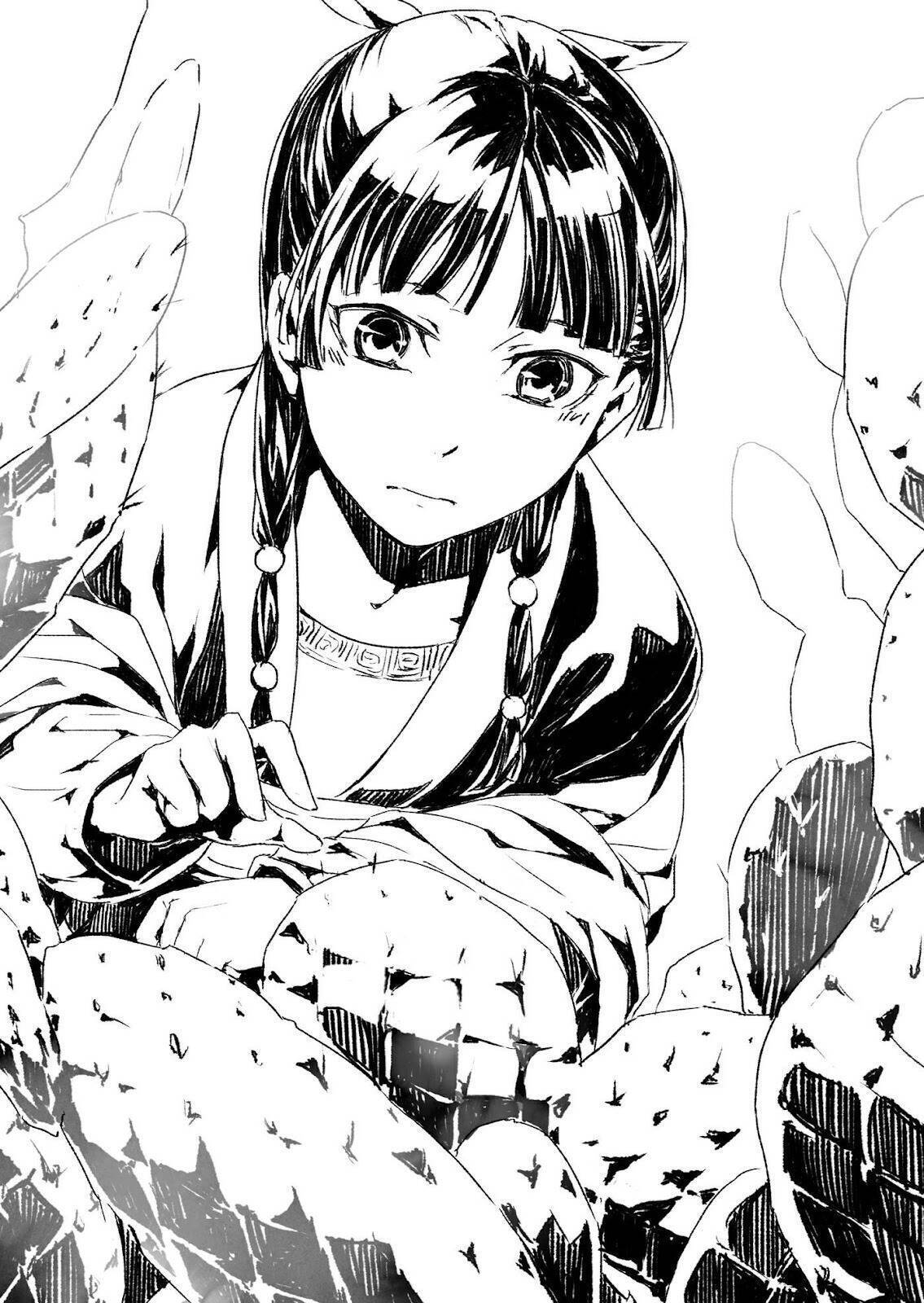 Maomao assentiu, impressionada. Suirei claramente havia se dedicado àquela planta, talvez desde que chegou ali. Ela tinha um caderno nas mãos e desenhava o cacto com diligência.