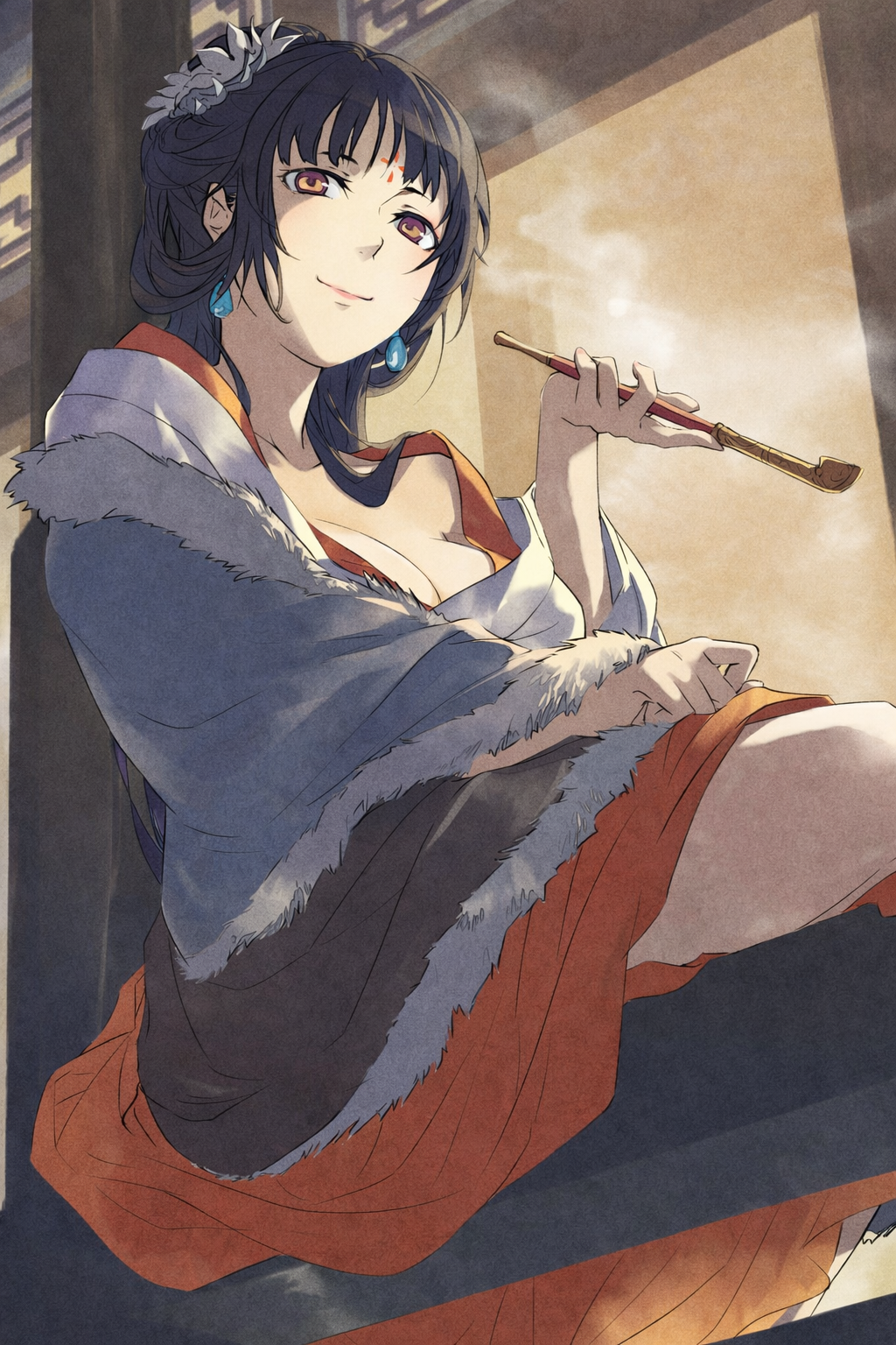 Com a máscara de volta ao rosto, Jinshi entrou na carruagem, e Maomao o observou enquanto se afastava. Enquanto estava ali, teve a sensação de que alguém a observava. Ao se virar, viu uma cortesã apoiada no corrimão do segundo andar, fumando um cachimbo de forma provocante. Era Pairin, uma das Três Princesas. Seu manto não conseguia esconder muito bem seus seios fartos.