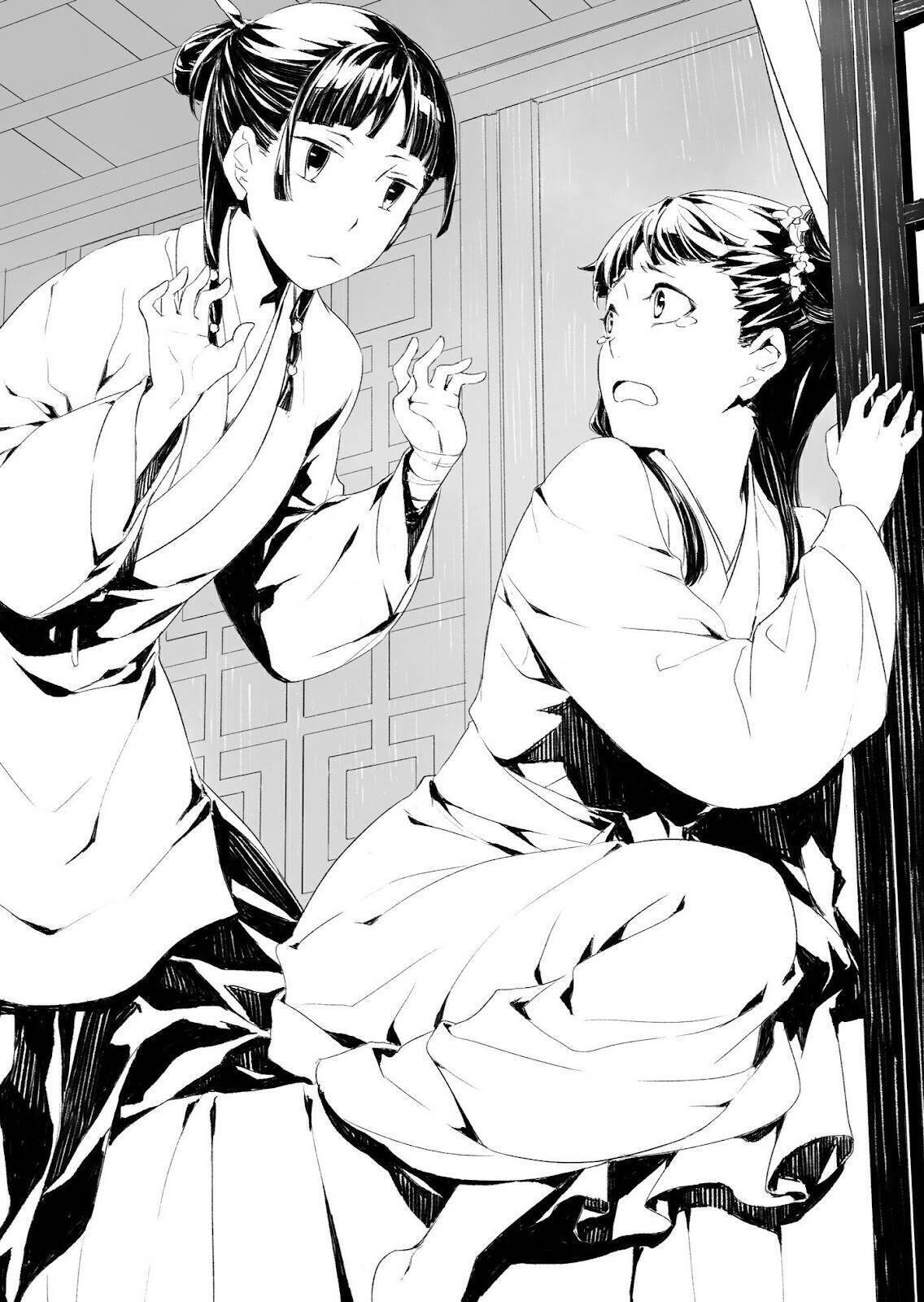 Maomao e os médicos foram expulsos do prédio antes que tivessem a chance de questionar a concubina. Parecia que a antiga dama de companhia chefe queria agir antes que Maomao pudesse realizar o exame, mas a manobra de atraso não tinha rendido tempo suficiente para isso. Em vez disso, pode-se dizer que ela recorreu à força.