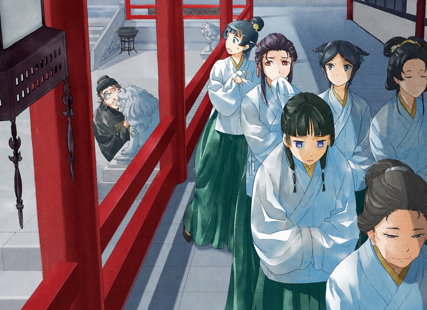 As novas damas da corte, cinco, incluindo Maomao, caminhavam com passos leves. Com tantas filhas de oficiais reunidas, Maomao esperava que pelo menos uma tivesse os pés enfaixados, mas, por coincidência, todas pareciam ter pés saudáveis.