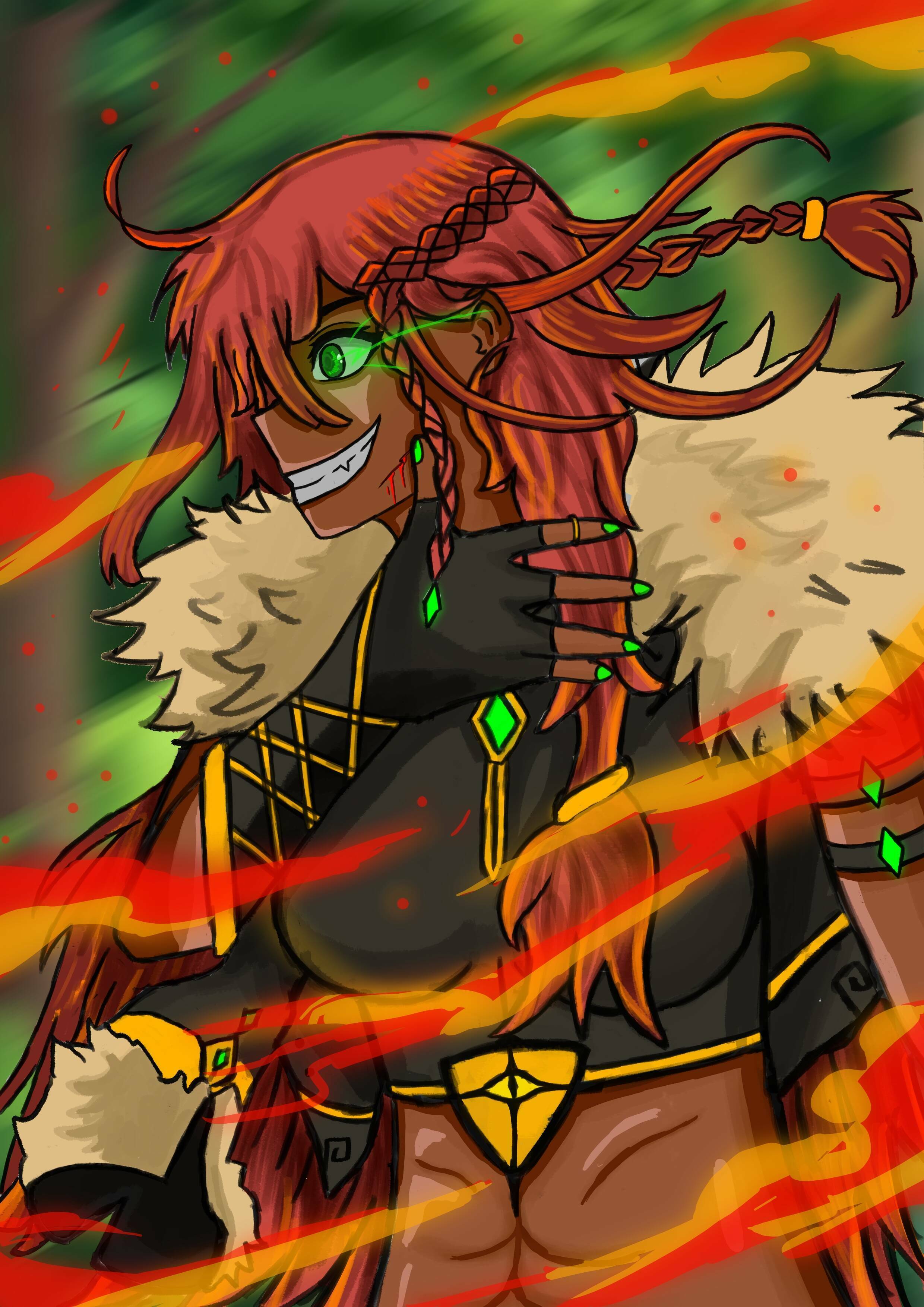 Do outro lado da clareira, a figura dela se erguia imponente. Olhos verdes como esmeraldas faiscavam sob longos cabelos escarlates que pareciam chamas vivas. Um sorriso estranho curvava-se em seus lábios enquanto me observava.
