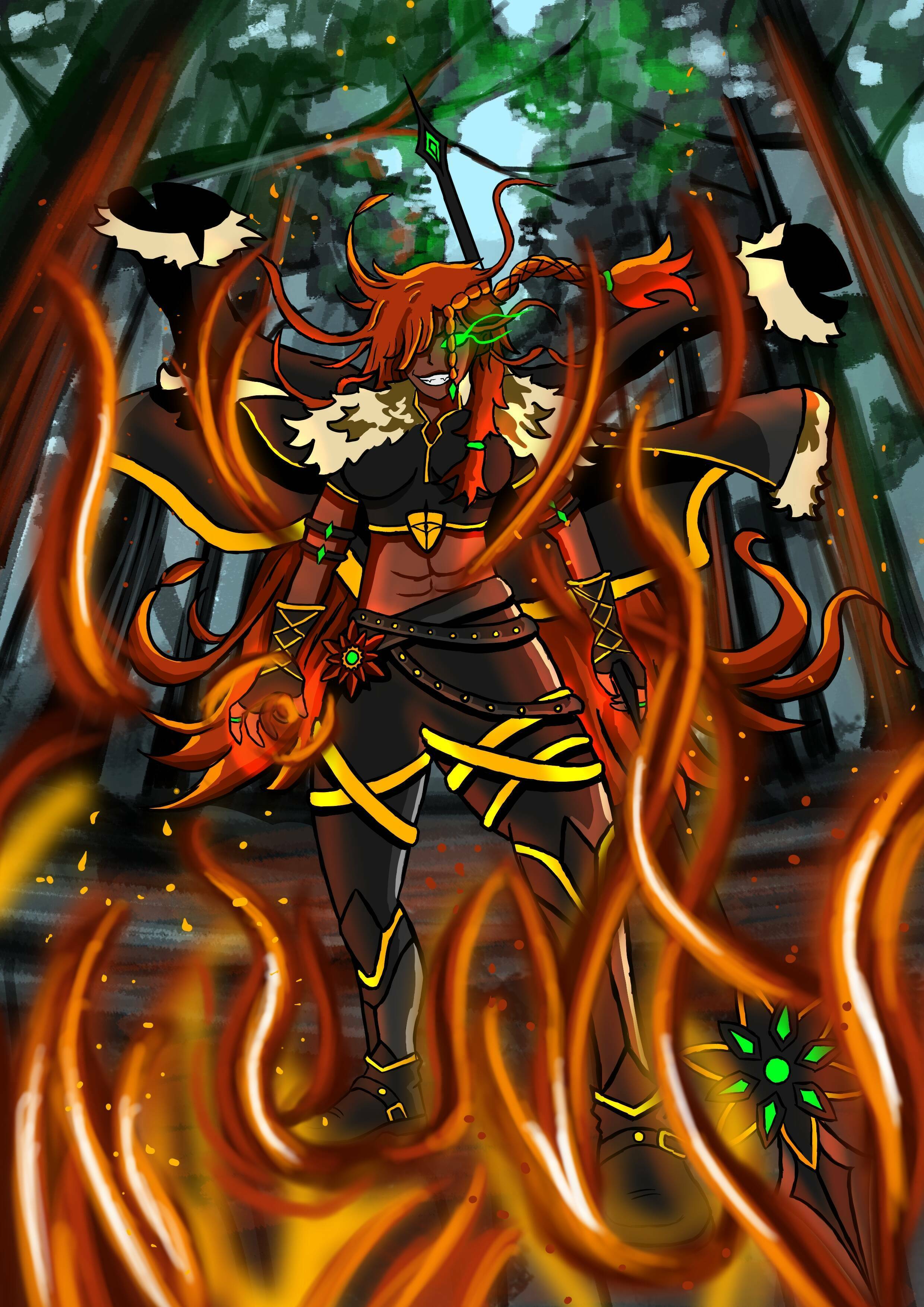 Chamas surgiram em torrente, abrindo-se como pétalas incandescentes de uma gigantesca flor. A lótus flamejante desabrochou na mata, e o fogo se espalhou violentamente, engolindo árvores e transformando o mundo ao redor numa tempestade ardente.