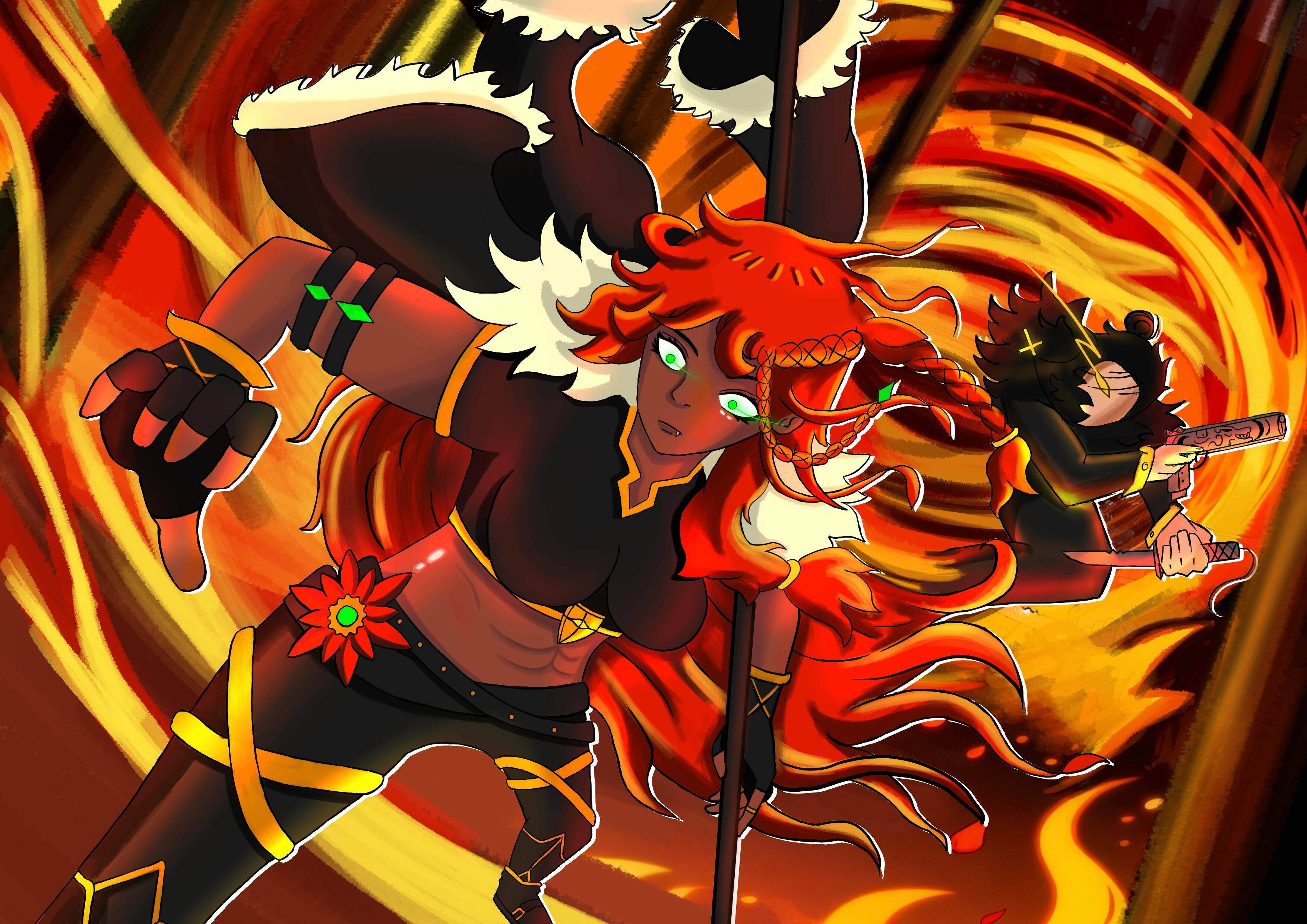 Lilith parecia completamente à vontade, apoiada na própria lança fincada no chão. Ao seu redor, uma pequena área permanecia livre das chamas, um oásis de calma em meio ao inferno ardente que consumia o restante da floresta.
