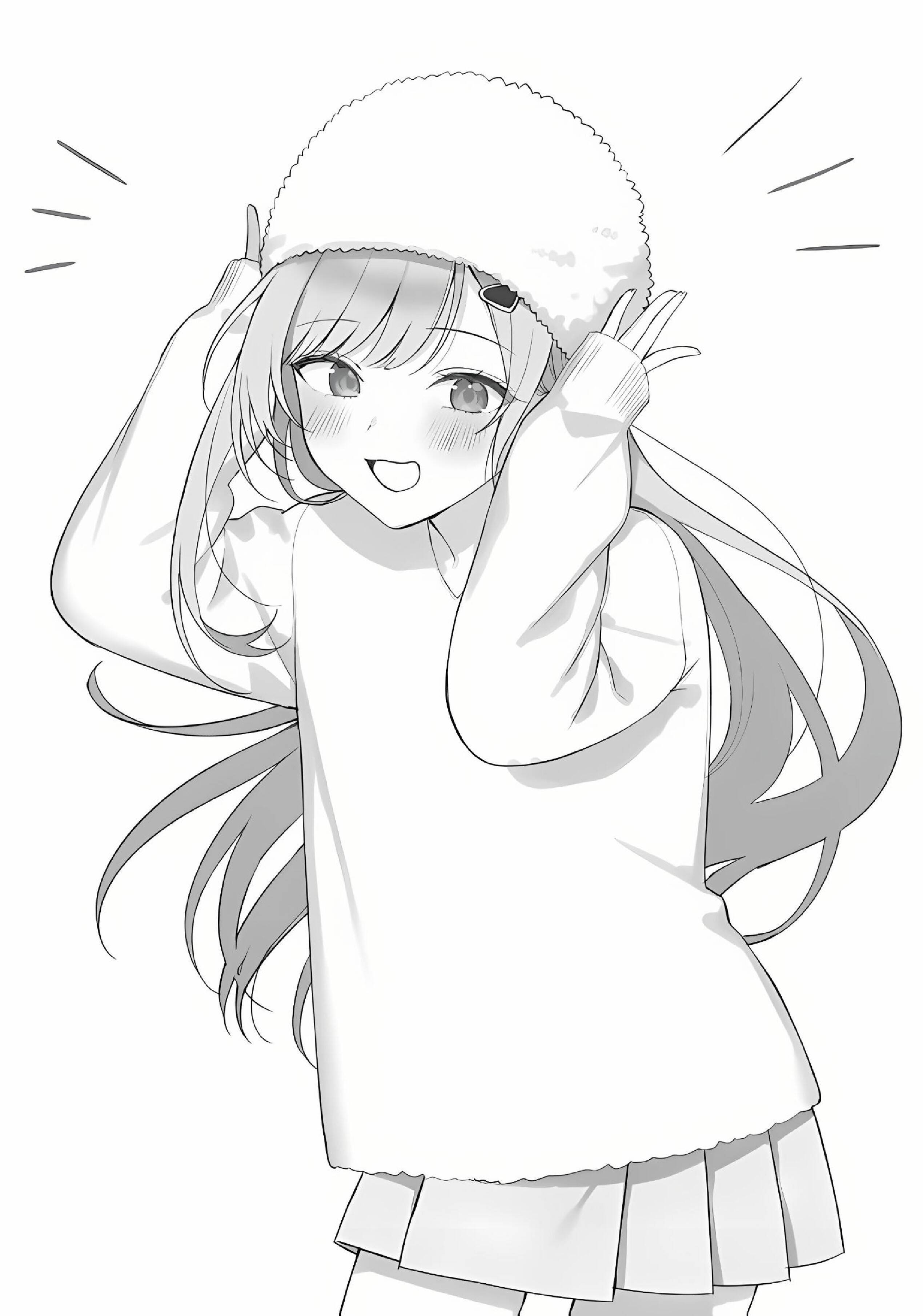 “Sim, como estou?” Ela abriu os braços, exibindo sua roupa — um suéter branco felpudo combinado com uma minissaia azul-clara. Era claramente o conjunto que Shimizu-san e as outras lhe deram de presente, já em bom uso.