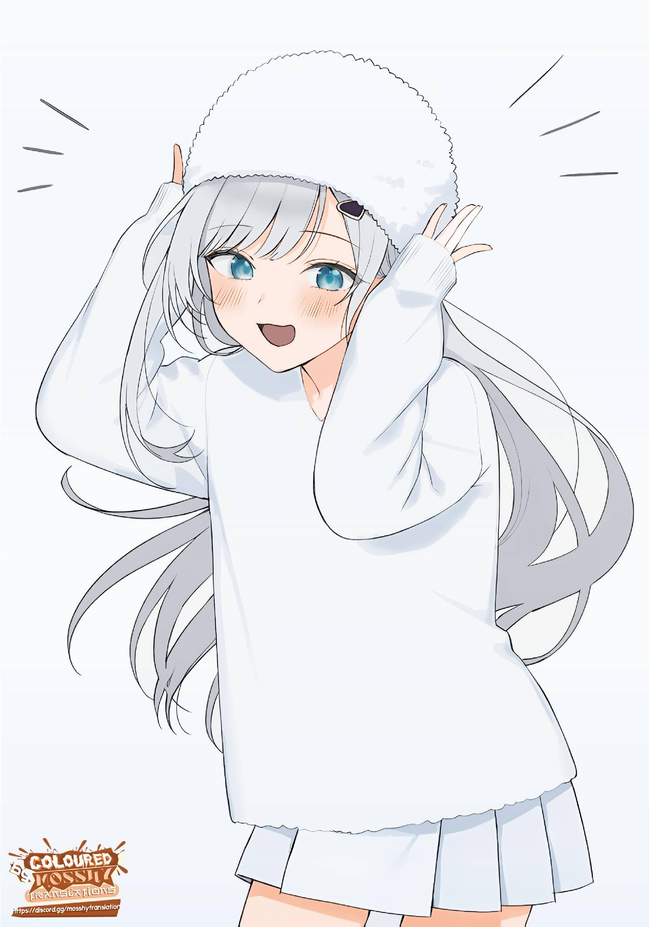 Era um gorro de tricô branco e fofo, daqueles que se vê em países com neve, combinando perfeitamente com seu suéter. O modelo a complementava sem esforço, e percebi que Kaguya-san devia tê-lo escolhido pensando no presente de Shimizu-san e dos outros. Ela provavelmente o pegou depois de deixar Livi no hotel perto da Estação Okayama.
