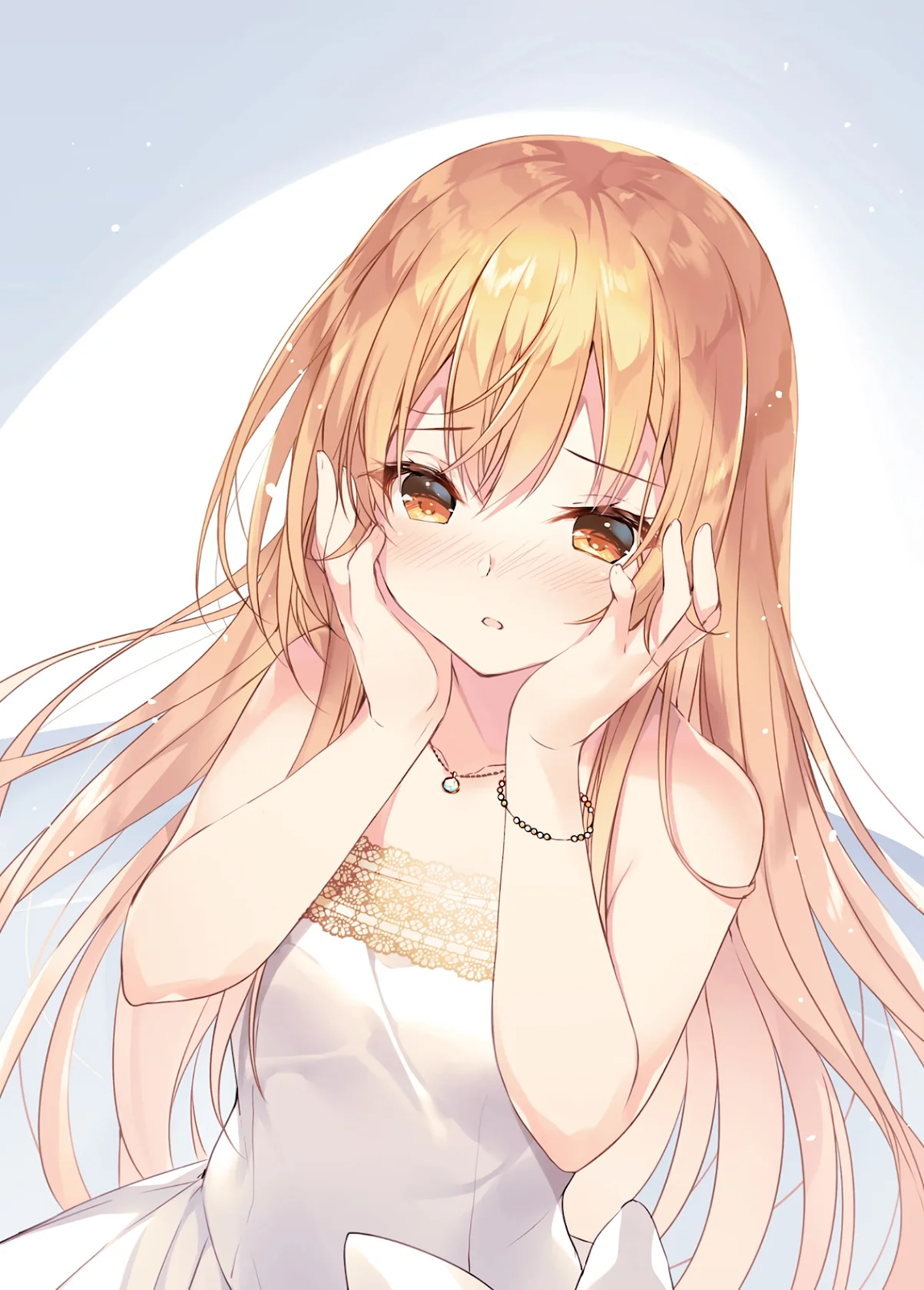 Diante de mim estava uma bela garota de cabelos cor de âmbar. Hinako, vestindo um elegante vestido branco, aproximou-se com passos curtos.