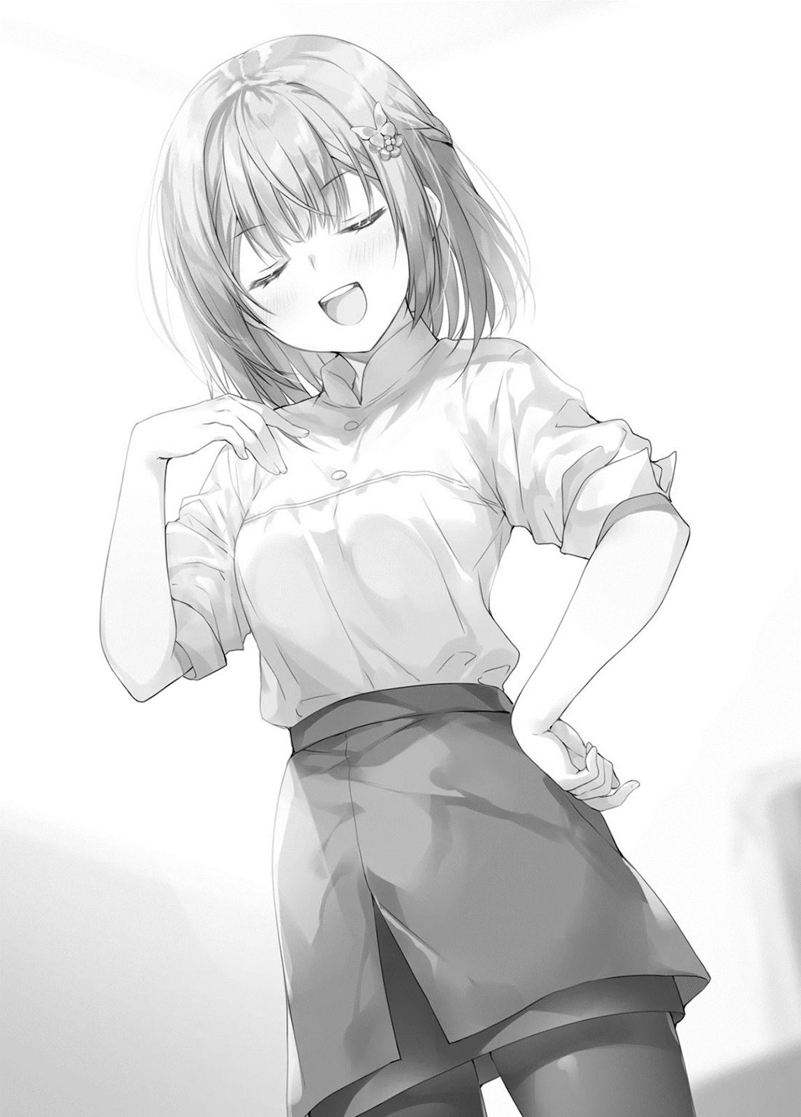Ela vestia uma camisa branca de mangas compridas, com as mangas dobradas por causa do calor do verão, combinada com uma saia preta e um discreto avental de garçonete carmesim por cima. Era um uniforme clássico, com um leve toque de elegância. Ainda assim, a garota que eu conhecia sempre preferiu roupas práticas e fáceis de se movimentar. Fazia sentido para um uniforme de trabalho.