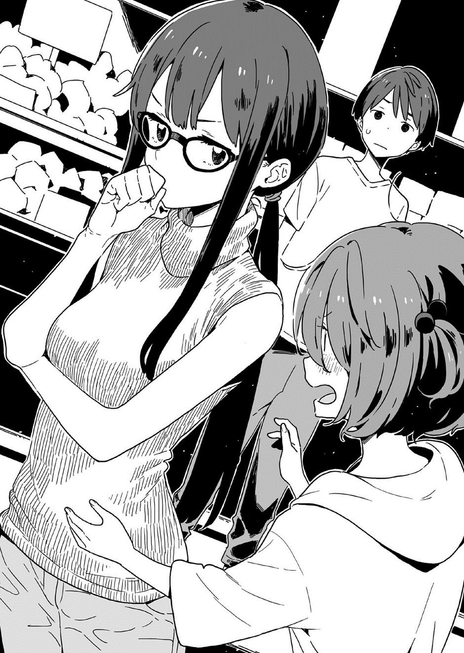 Depois de terminar de observar as nuvens passando em um céu sem nuvens — e de refletir sobre as regras modernas de censura —, fui até a área de descanso. Yanami estava parada perto da seção de lanches, de braços cruzados, com uma expressão séria.