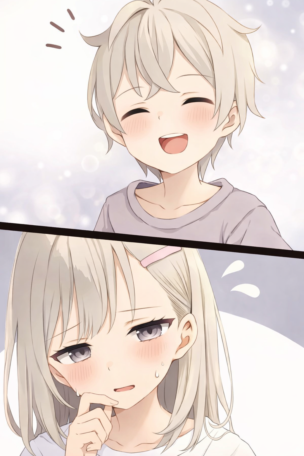 Alegria e desespero. Os irmãos, exibindo emoções conflitantes, foram observados com um sorriso caloroso por sua mãe.