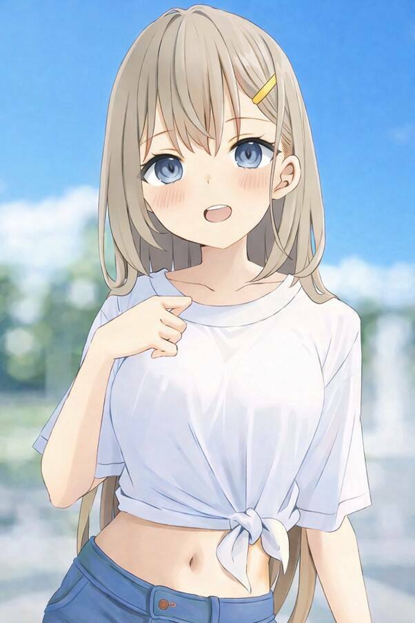 Depois de receber a permissão de Haruto, Ayaka amarrou o excesso de tecido da camisa ao redor da cintura.