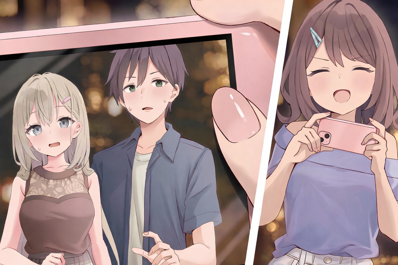 Dizendo isso, Haruto tirou uma foto de Ayaka e Saki com seu smartphone.